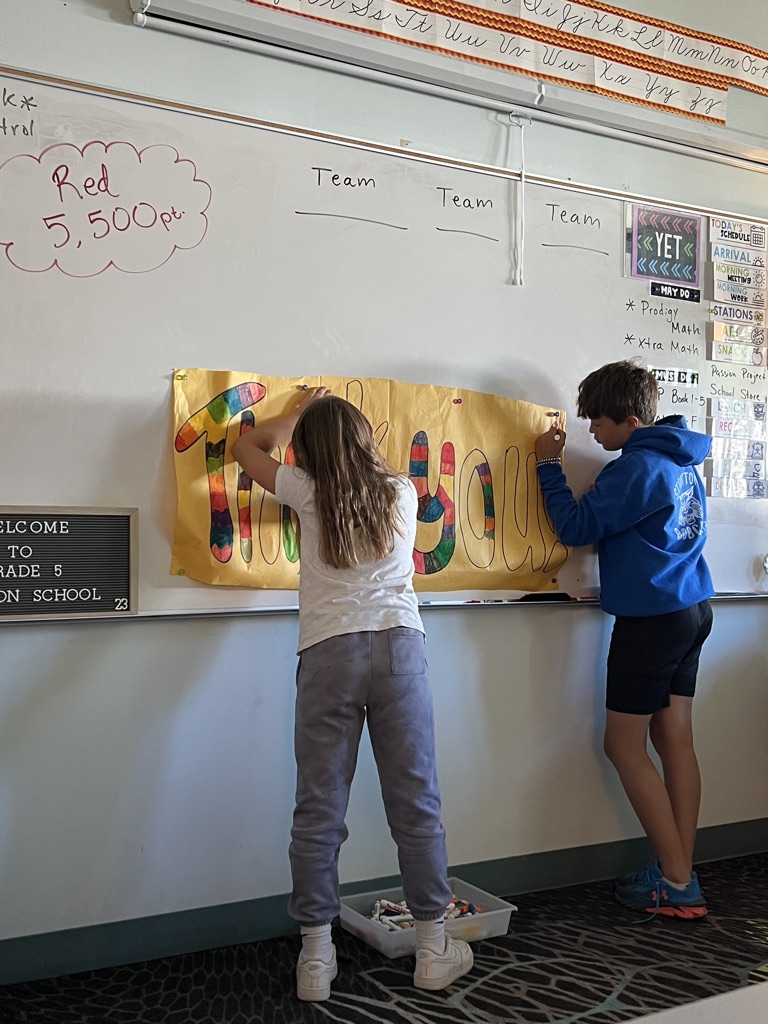 Grade 2 has been busy with their learning. Pictures include: flashlight Friday reading, “roll a story” writing prompts, ABC order word work and “whats behind my back” math.